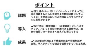 「パレット単位で利用できる柔軟性と、既存の出荷フローを大きく変えずに導入できる点が決め手となりました。富士通では精密機器を取り扱っておりトラック内での保定方法やターミナルでの積替え作業が輸送品質影響しないか不安視されましたが、事前の輸送テストやSSTの品質管理体制を説明頂くことで問題無いことが確認できました。」と同氏は導入の決め手を語ります。